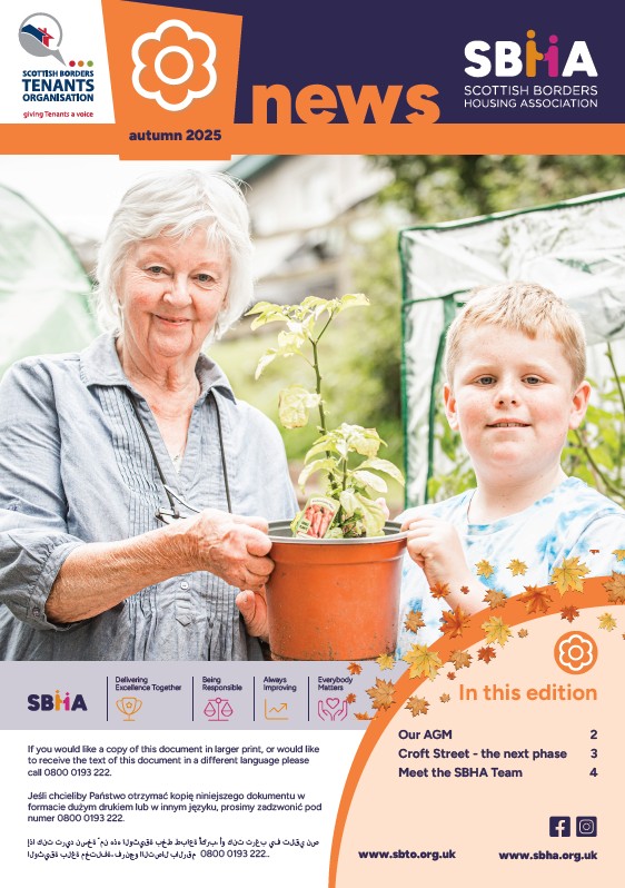 Scottish Borders Tenants Organisation AGM Tuesday 28th October 2025, 6.30pm – 7.30pm. SBHA Head Office, Whinfield Road, Selkirk TD7 5DT. Join us for a review of Tenant and community engagement and consultation during 2024-25. All SBHA Tenants Welcome.