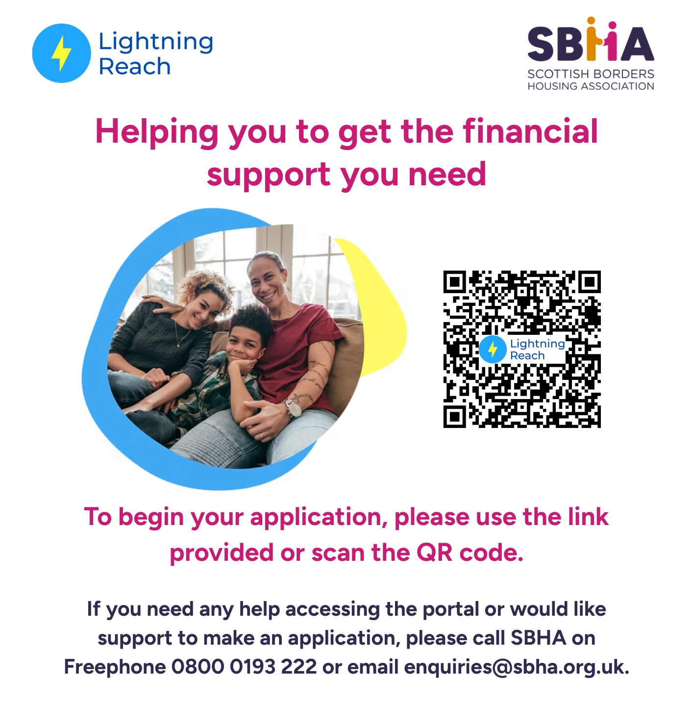 Lightning Reach – a free portal that helps you access financial grants from charities, councils, and other sources. Find out more: Lightning Reach – SBHA Tenants or scan the QR code to get started.