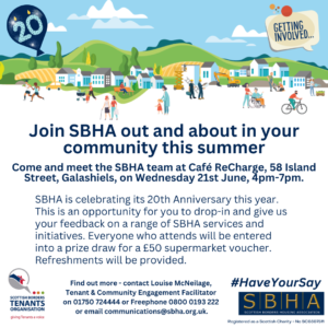 You are invited to join SBHA team members in Galashiels this Wednesday 21st June – drop in 4pm-7pm at Café ReCharge, 58 Island Street, Galashiels.