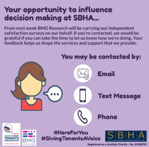 From next week BMG Research will be carrying out independent Tenant satisfaction surveys on our behalf. If you’re contacted, we would be grateful if you can take the time to let us know how we’re doing. Your feedback helps us shape the services and support that we provide.